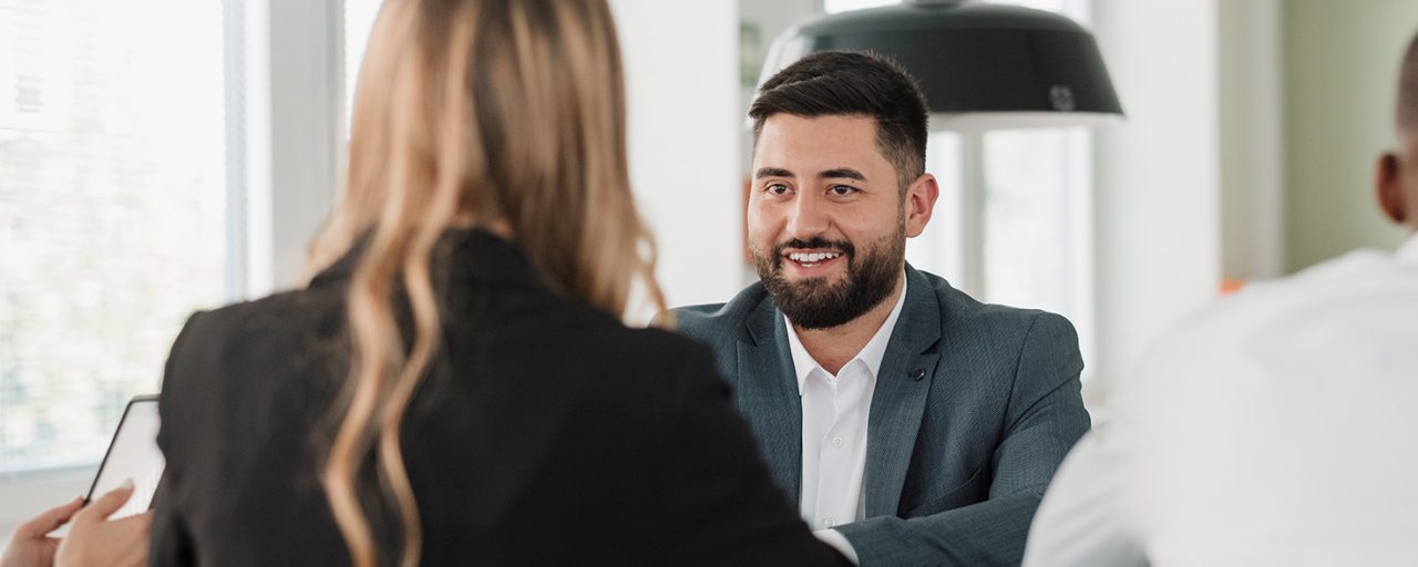 Man and woman talking on a sunny day at the rental car lot.